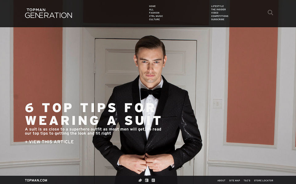 As Topman marketing manager I commissioned GENERATION , a daily digital men’s journal providing a unique cultural insight into the worlds of fashion, film, music and art through the lens of the UK’s biggest high-street men’s brand.
